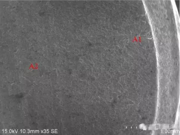 圖6~8所示為A區(qū)形貌,可見(jiàn)該區(qū)斷口靠近邊緣(A1區(qū))存在輪輻狀臺(tái)階,微觀可見(jiàn)磨損痕跡,靠近芯部(A2區(qū))可見(jiàn)疲勞輝紋。